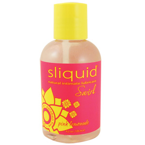 A bottle of Sliquid “Swirl” natural lubricant – Pink Lemonade flavor