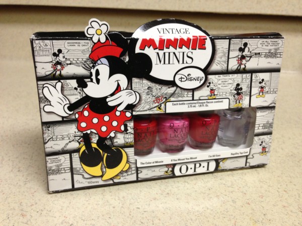 Mickey’s favorite girl gets an OPI set of her own. The set includes mini bottles of the color of Minnie (a shimmery red), If You Moust You Moust (a creamy cool pink), and I’m All Ears (a magenta-ish jelly polish with sparkles). The set also includes a mini bottle of OPI Rapi-Dry top coat.