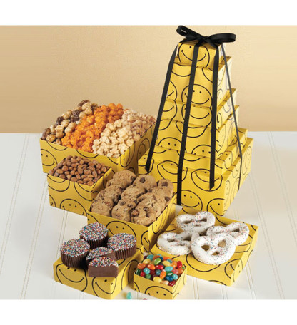 Perhaps the best way to put a smile on someone’s face is to provide a good example of what one looks like! And a Smiley Face Tower does just that. These simply adorable boxes stand six high and hold honey roast peanuts, assorted Jelly Belly® beans, creamy, chocolate fudge, chocolate chip cookies, 4 rainbow Bavarian pretzels and a box of our high-quality Cheese, Buffalo Ranch and Almond Pecan corn. The gift boxes are stacked sky high and tied with a black ribbon.