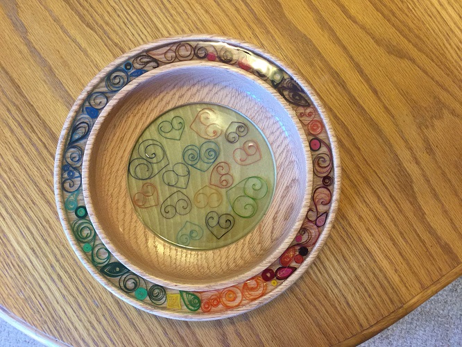 Oak and poplar bowl with multi-colored quilling embedded in clear resin.