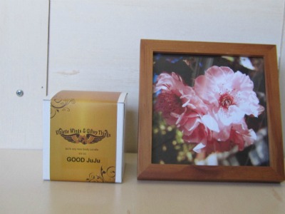 This raffle item is a 5″ X 5″ framed original photo of pink tree blossoms by Lisa-Marie. It also includes a beautifully scented soy wax candle by Magic Fairy Candles called “Good JuJu”, which is a blend of frankincense, bayberry, and cedar. Soy candles burn cleaner and slower than regular candles making them very long lasting and environmentally friendly.