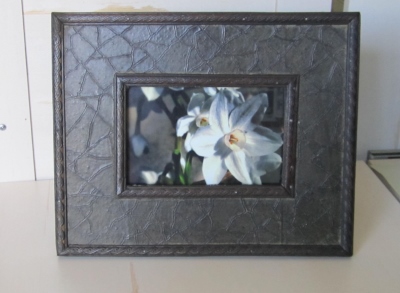 Photo printed on HP Premium soft gloss photo paper. Frame is slightly larger than 2½” wide and is a faux leather style on wood. Has kick-back stand, but no mounting hardware.