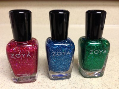 A trio of Zoya glitter polishes from the Zoya Gems and Jewels collection: Kissy is a pink and red base with holographic bar glitter, Rina is a green shimmer base with green and teal bar glitter, Twila is a blue shimmery base with brighter blue bar glitter. Perfect for layering!