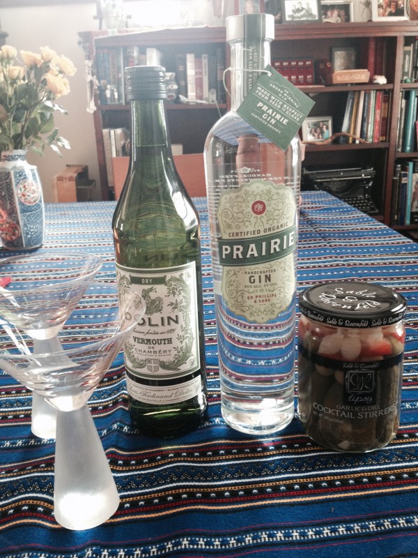 This very elegant cocktail gift set includes a bottle of Prairie organic gin, a bottle of dry Dolin vermouth de Chambery, a jar of garlic and dill cocktail stirrers and two fancy glasses.