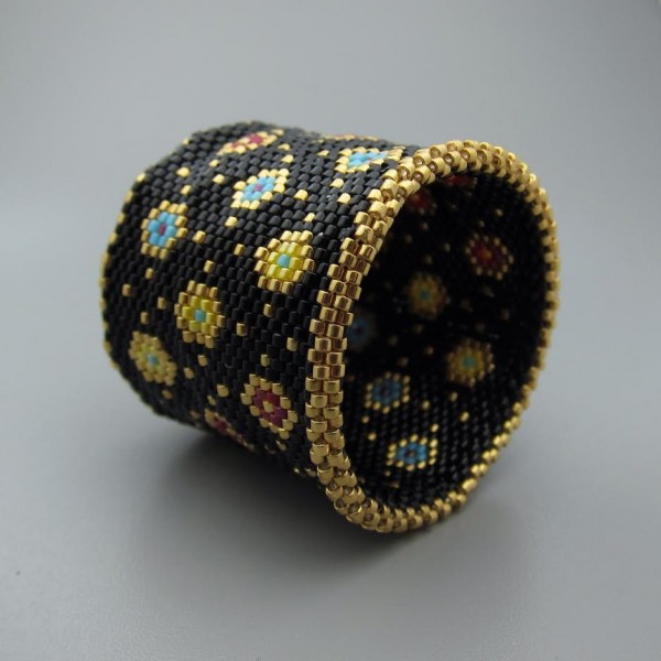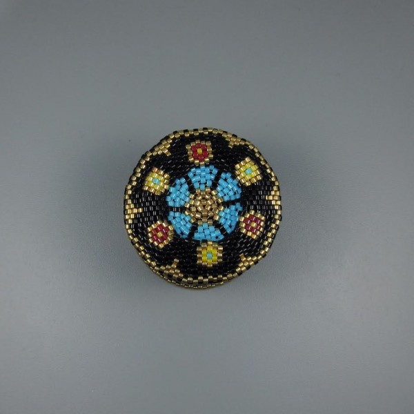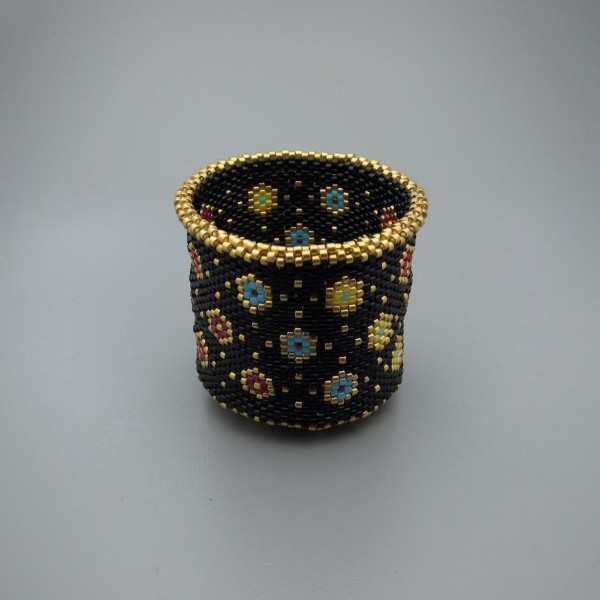 Another gorgeous piece of beadwork from Julia Henry: this small beadwoven basket is 1.5 inches in diameter and about 1 5/8 inches tall.