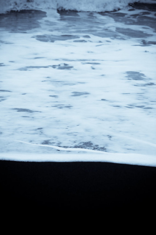 A black volcanic sand, white waves approach ahead of an intense sub arctic storm.