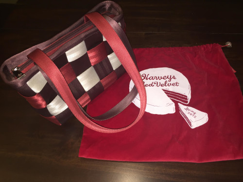 Harvey’s Limited Edition Red Velvet Seatbelt Bag, designed in a combination of red, merlot and vanilla seatbelts. The bag is fully lined with a dark red velvet lining with brown damask design. Includes red velvet storage bag.