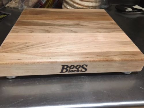 18″ x 12″ x 1.25″ cheese board with removable feet and Boos logo burned into the side.