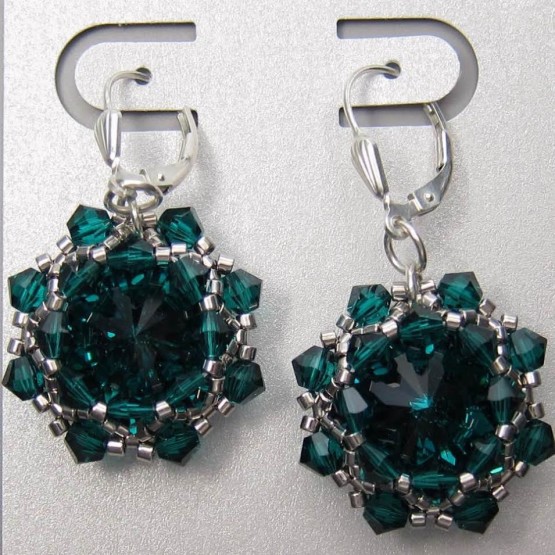 Deep emerald crystals beadwoven with Japanese silver seed beads and finished with sterling silver lever back earwires. These earrings are 3/4 inch diameter.