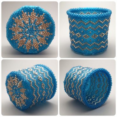 This small (1.5″ x 1.5″ x 1.5″) beaded basket is handcrafted with needle and thread.